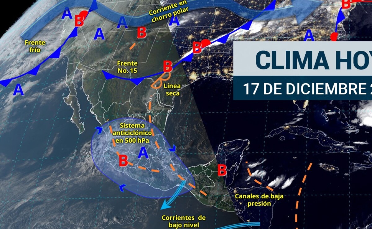 Para este 17 de diciembre, el clima en México se verá seriamente afectado por el frente frío No. 15 que se extenderá sobre la frontera norte del país, interactuando con un canal de baja presión en el noreste y oriente del país. Esto generará vientos fuertes y posibles tolvaneras en estados como Coahuila, Nuevo León y Tamaulipas. Además, se anticipan lluvias e intervalos de chubascos con descargas eléctricas en diversas regiones, incluyendo Zacatecas, San Luis Potosí, Hidalgo, Puebla y Veracruz.