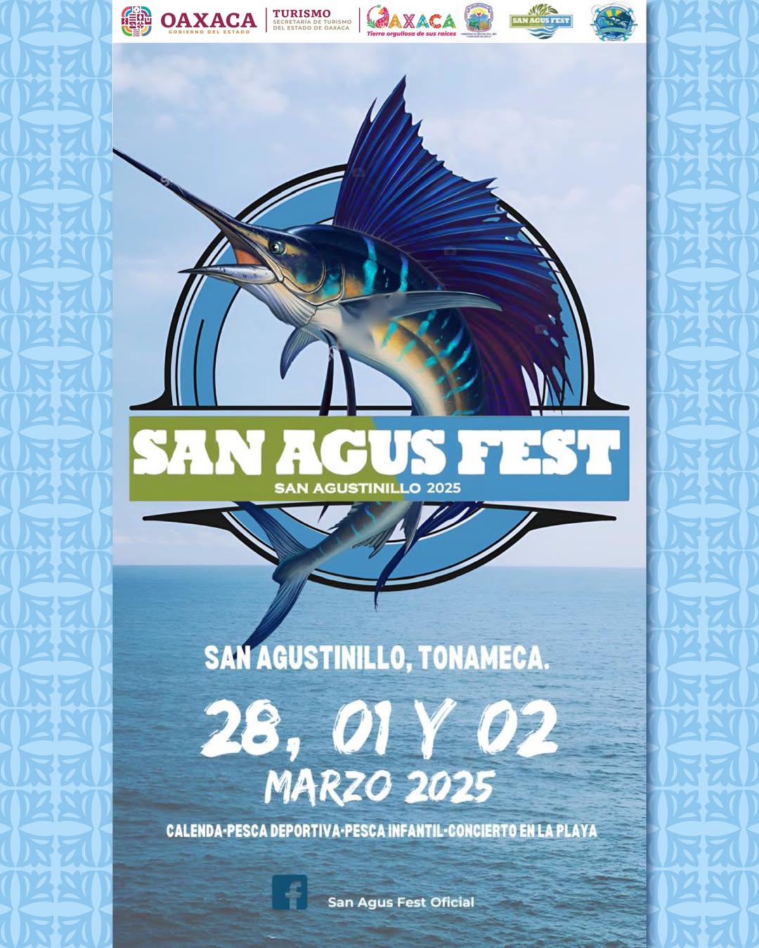 San Agus Fest 2025: Del 28 de febrero al 2 de marzo, San Agus Fest 2025 se llevará a cabo en San Agustinillo, Santa María Tonameca. Este festival de pesca atraerá a clubes y equipos de todo el país y el extranjero, generando una importante derrama económica para las localidades cercanas, como Mazunte, Zipolite y Puerto Ángel. El evento contará con la premiación en la Bahía Principal y conciertos de Costeños del Pacífico y Álvaro Monterrubio.