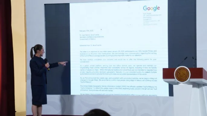 “Esto está mal”, dijo la mandataria el lunes al hacer público el texto de la misiva de Google. “Aquí lo que Google está haciendo es cambiarle el nombre a la plataforma continental de México y Cuba” aunque el decreto del presidente Donald Trump del 20 de enero deja claro que la denominación de “Golfo de América” sólo afecta a la parte estadounidense del golfo, indicó.