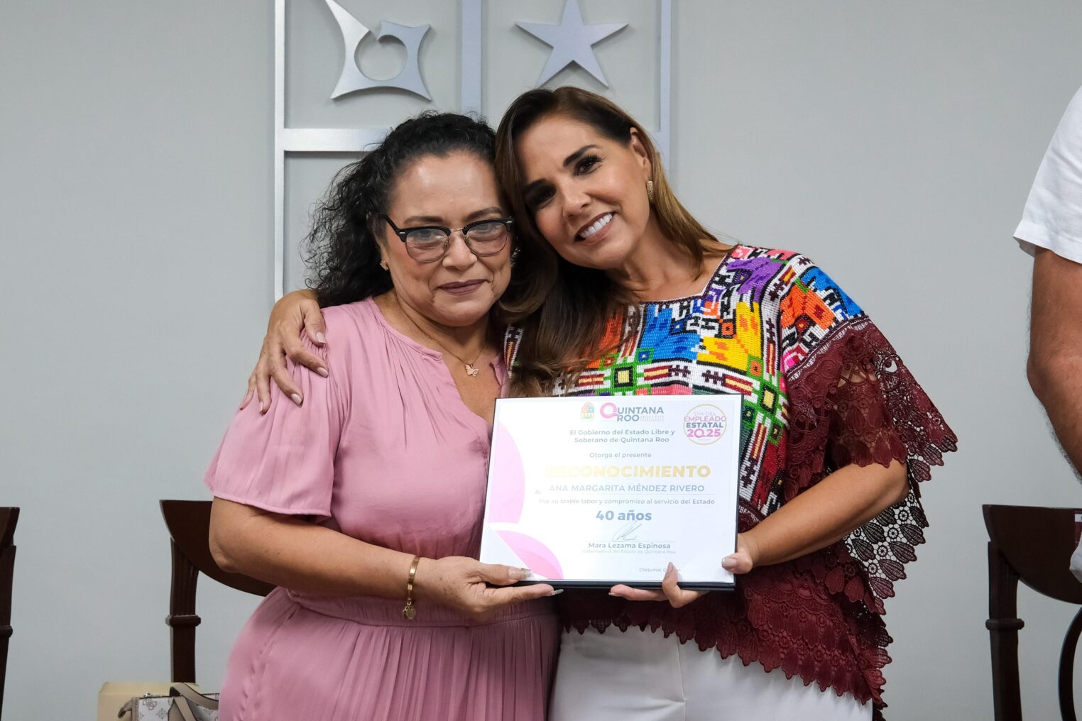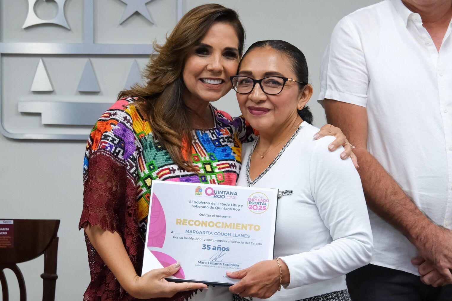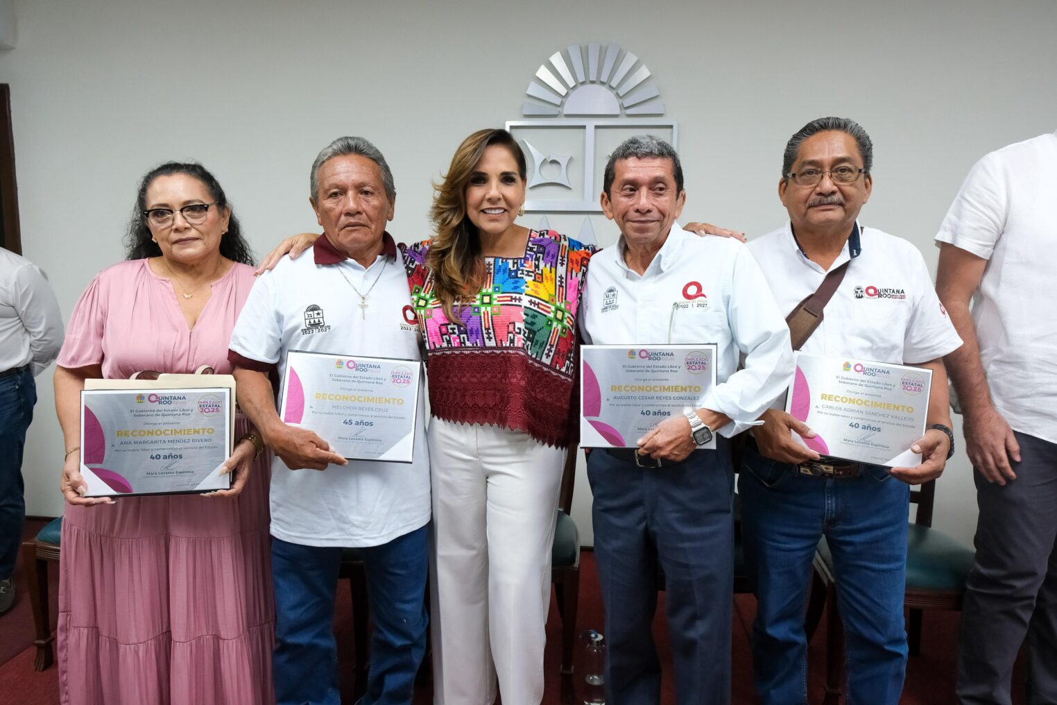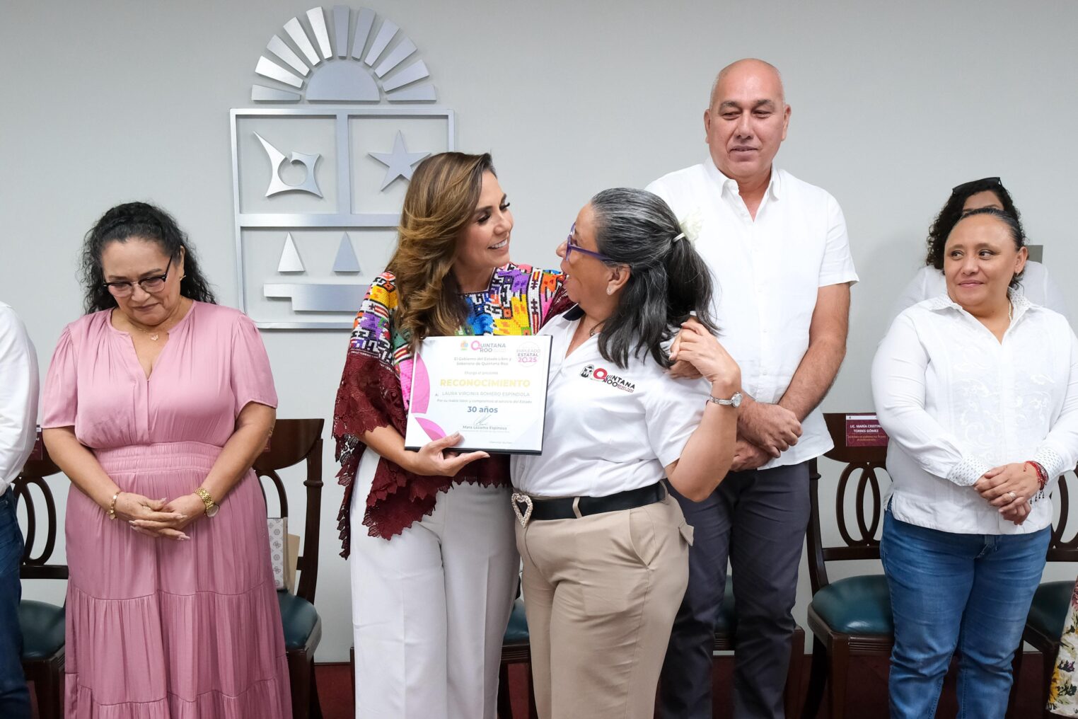 Durante el evento de entrega de estímulos y reconocimientos, la gobernadora de Quintana Roo añadió que hay trabajadores que llevan 20, 25, 30, 35, 40 y hasta 45 años dedicados al servicio público. “Cada año es una historia que vale la pena contar; son años de constancia, de entrega que ha ido creciendo con el tiempo, marcando el ritmo de una carrera que nunca se detuvo. El reconocimiento es también para su familia”, citó.