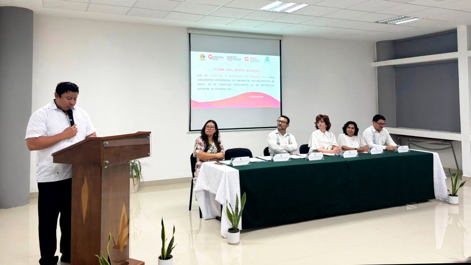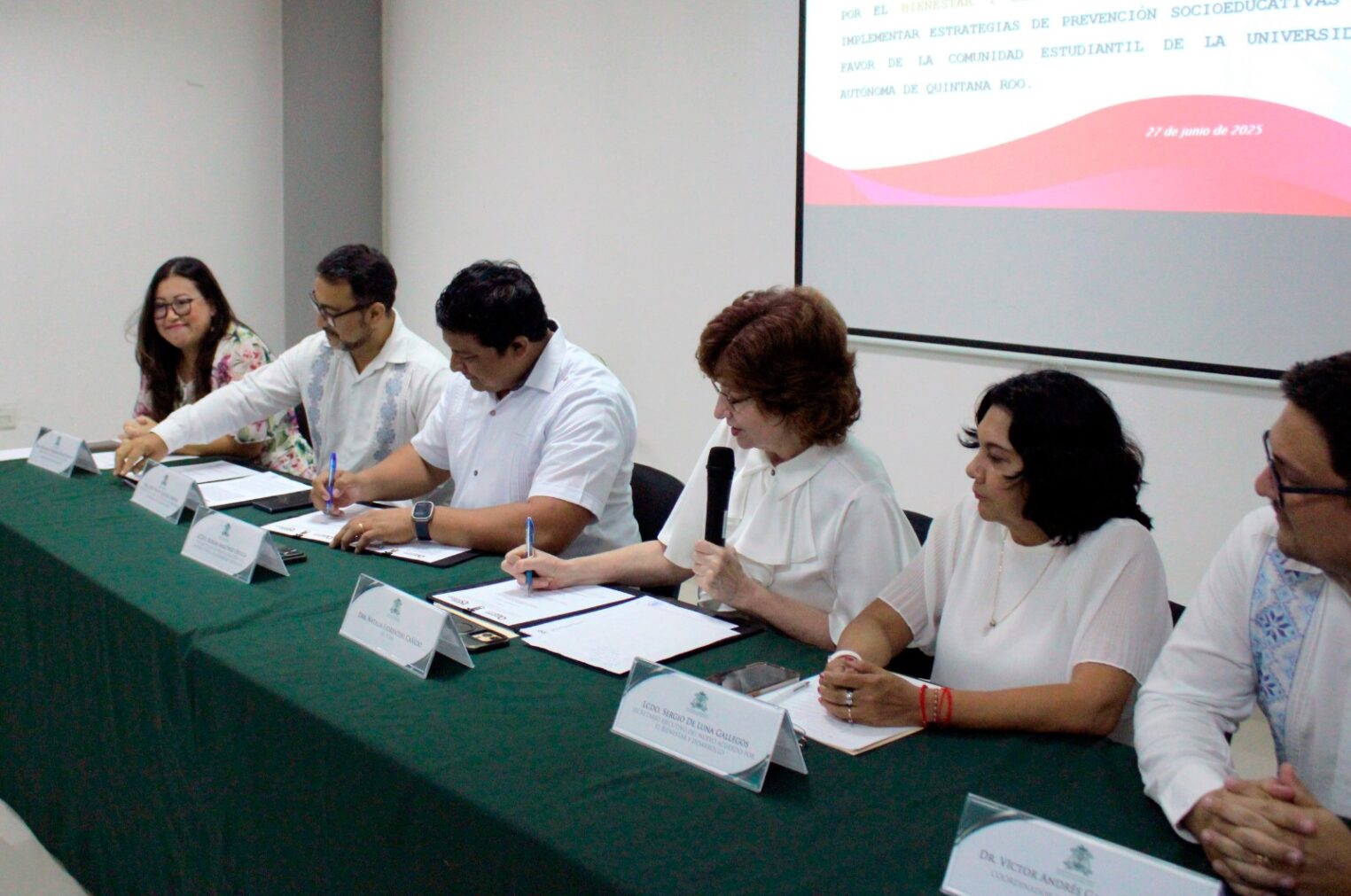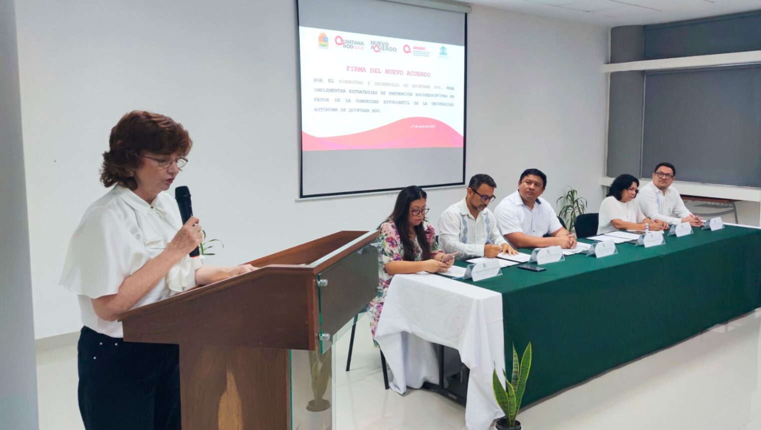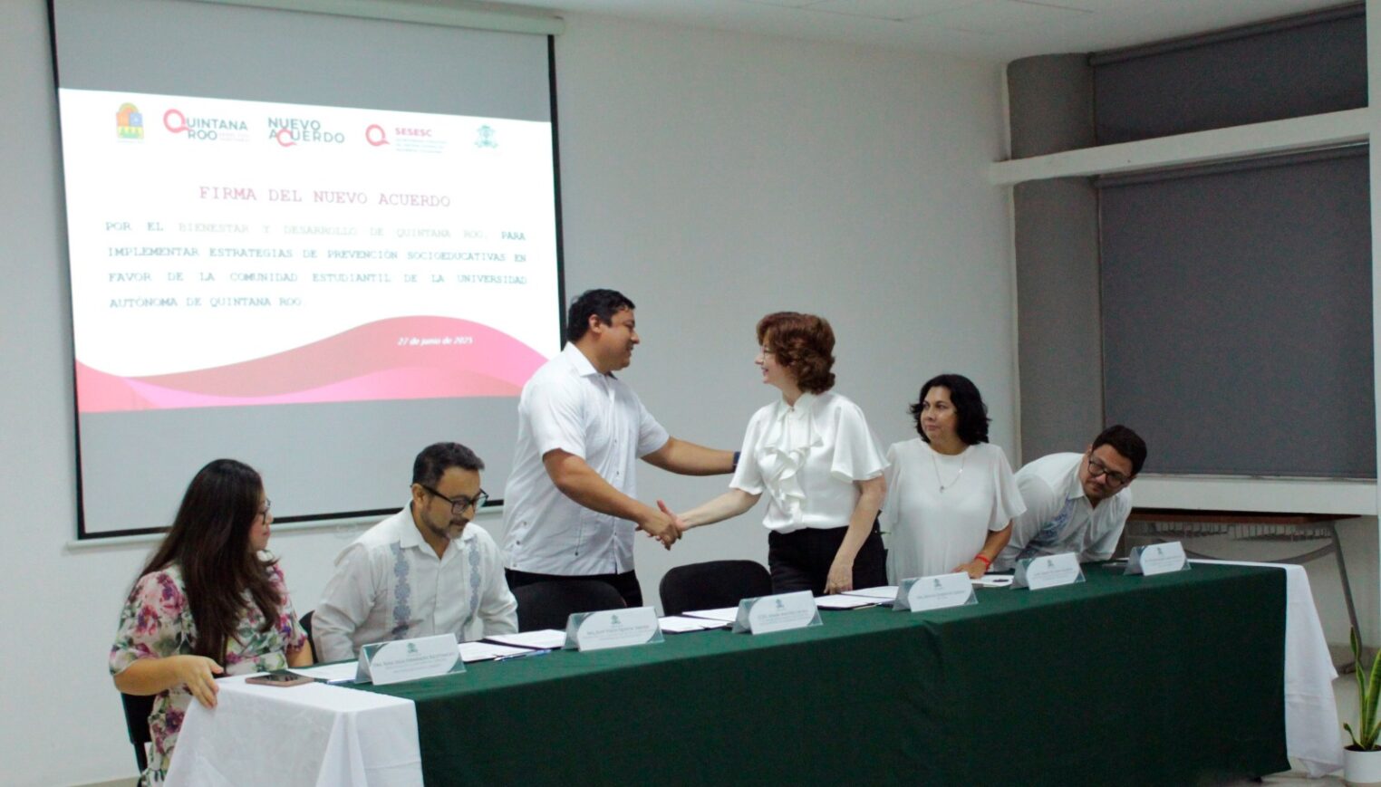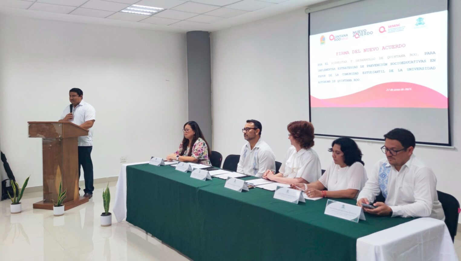 Con la finalidad de implementar estrategias de prevención socioeducativas en favor de la comunidad estudiantil, el Secretariado Ejecutivo del Sistema Estatal de Seguridad Ciudadana (SESESC) y la Universidad Autónoma de Quintana Roo (Uaqroo), firmaron un Nuevo Acuerdo por el Bienestar y Desarrollo de Quintana Roo, fortaleciendo la cultura de la prevención social del delito a través de estrategias de intervención y proximidad.