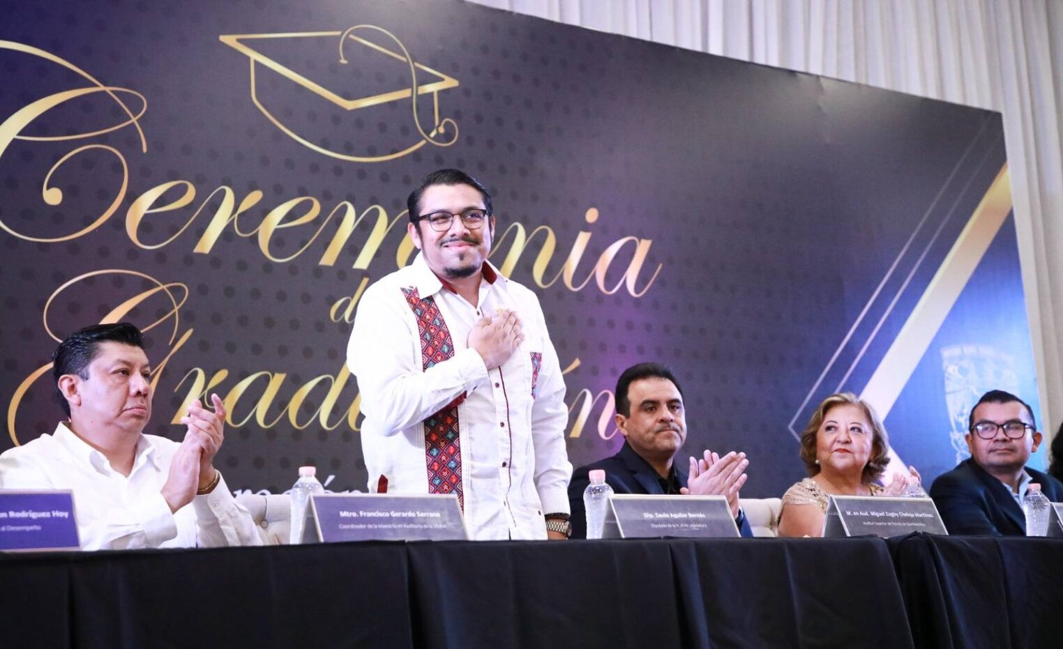 En su intervención, el diputado felicitó el logro alcanzado de las y los profesionistas, reconociendo el respaldo invaluable de sus familias para impulsarles a superar este reto académico.