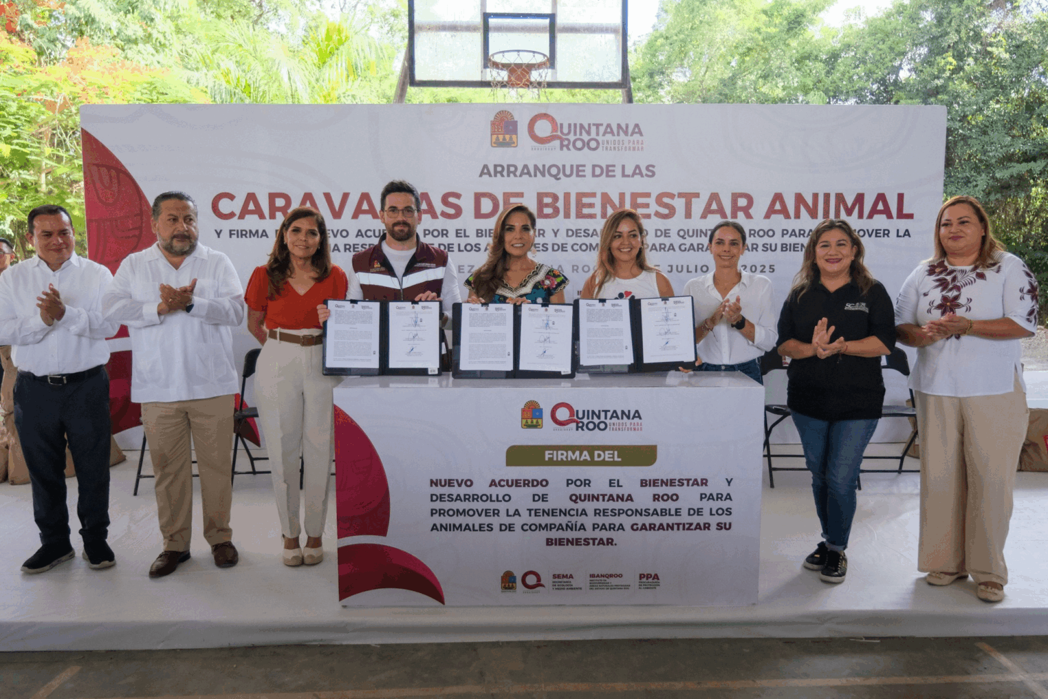Durante el evento, la gobernadora Mara Lezama firmó el Nuevo Acuerdo por el Bienestar y Desarrollo de Quintana Roo para Promover la Tenencia Responsable de los Animales de Compañía para Garantizar su Bienestar, flanqueada por la perrita Nena y Papi, un perrito de raza Pug. Asimismo, firmaron el secretario de Ecología y Medio Ambiente, Óscar Rébora Aguilera, y la sociedad civil, “Dejando Huella Na’ Lu’ Um”, representada por su presidenta, Mónica Chavarría Soriano.