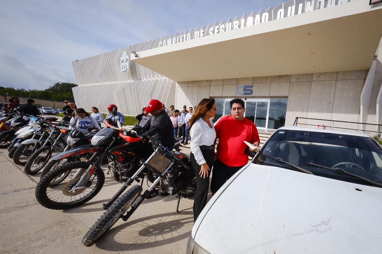 Un total de 12 motocicletas y un vehículo recuperados por la Fiscalía General del Estado fueron entregados a sus legítimos propietarios por la gobernadora Mara Lezama Espinosa junto con integrantes de la Mesa de Seguridad.