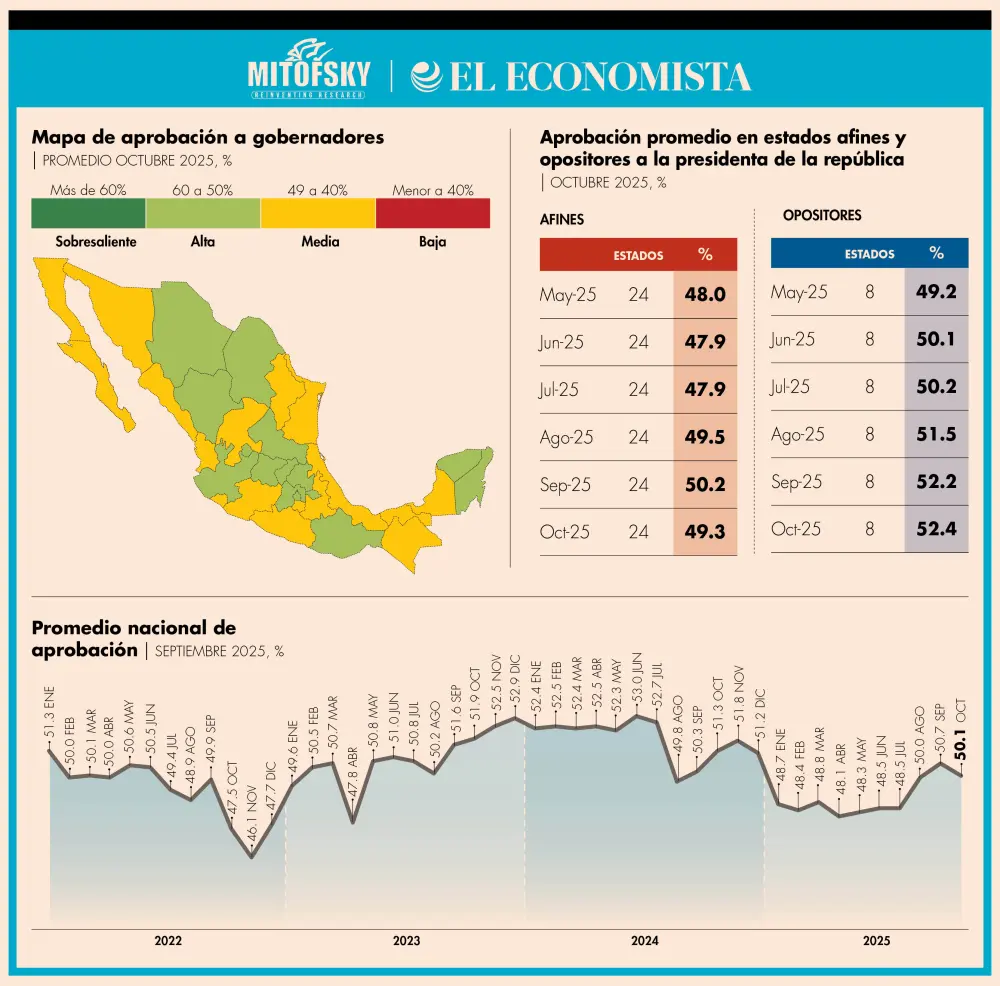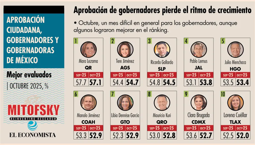 De acuerdo con el Ranking Mitofsky Capítulo: gobernadores y gobernadoras de México, medición mensual sobre aprobación ciudadana levantada para El Economista, 21 mandatarios estatales -16 de Morena, dos del PAN e igual número del PRI y uno del PVEM- disminuyeron su calificación sobre el desempeño en el cargo respecto de septiembre, mientras que solamente 11 -siete de Morena, dos del PAN y dos de MC- subieron de nivel frente al electorado.