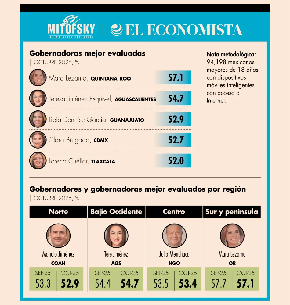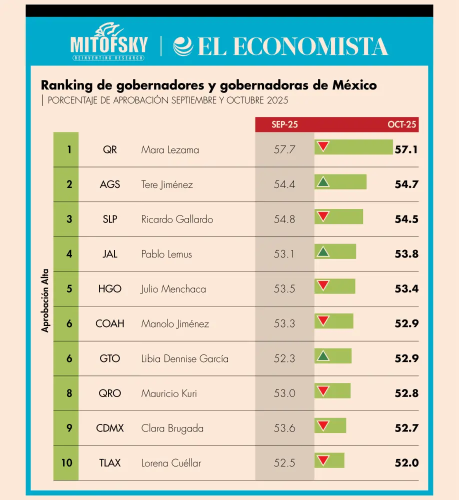 Mara Lezama encabeza el Ranking Mitofsky con 57.1% de aprobación entre los gobernadores mejor evaluados en méxico.