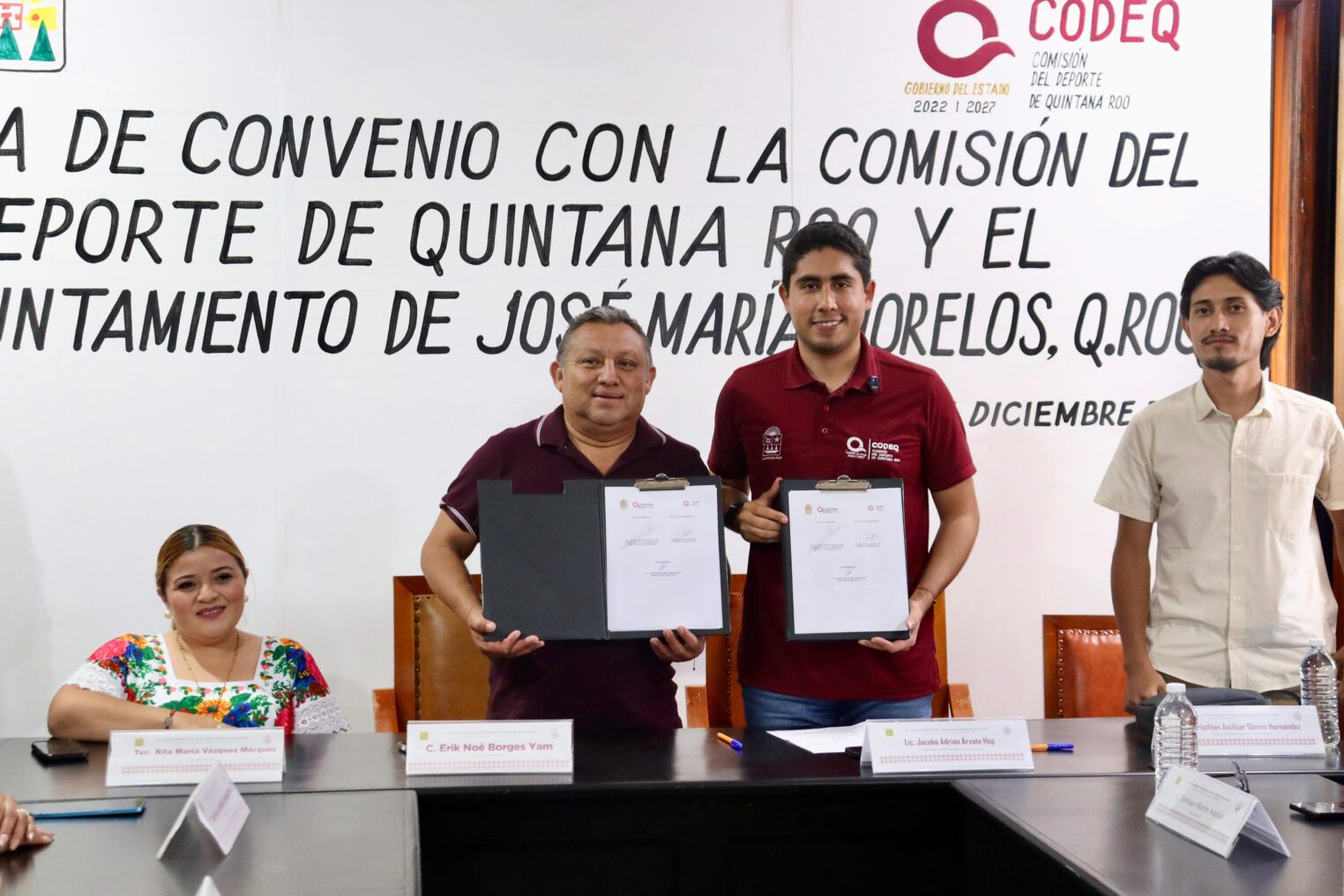 Para impulsar y hacer crecer la práctica del deporte en la Zona Maya de Quintana Roo y con ello brindar las mismas oportunidades a todas y todos los deportistas quintanarroenses, la Comisión del Deporte de Quintana Roo (Codeq), presidida por Jacobo Arzate Hop, firmó un acuerdo de colaboración y trabajo con el Ayuntamiento de José María Morelos, encabezado por el presidente municipal Erik Borges Yam.