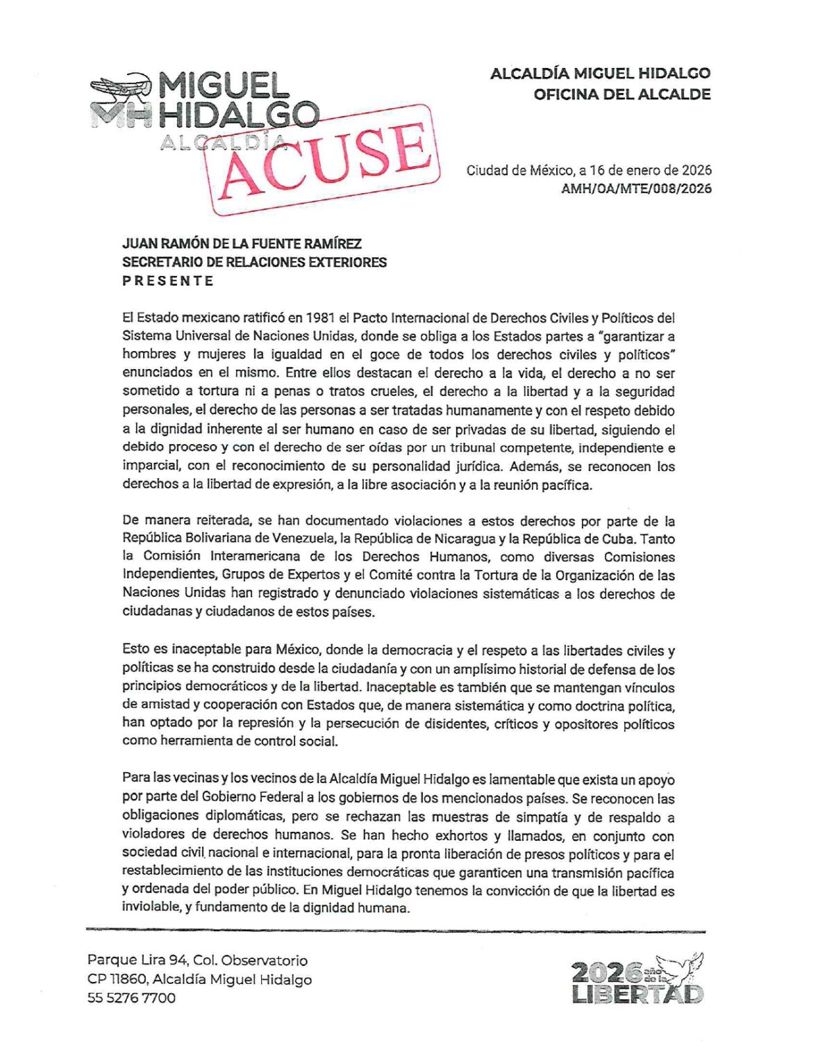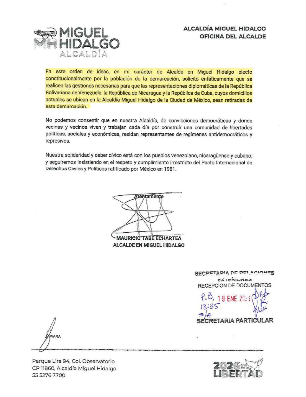“En mi carácter de alcalde en Miguel Hidalgo electo constitucionalmente por la población de la demarcación, solicito enfáticamente que se realicen las gestiones necesarias para que las representaciones diplomáticas de la República Bolivariana de Venezuela, la República de Nicaragua y la República de Cuba, cuyos domicilios actuales se ubican en la alcaldía Miguel Hidalgo de la Ciudad de México, sean retiradas de esta demarcación”, se lee en el escrito enviado a la cancillería.