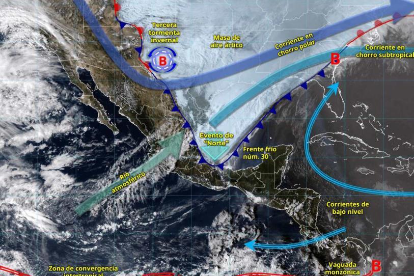 Simultáneamente, la masa de aire ártico asociada al sistema frontal, mantendrá ambiente frío y bancos de niebla sobre entidades del norte, centro, oriente y sureste del país; así como ambiente muy frío a gélido en zonas serranas de la Mesa del Norte.