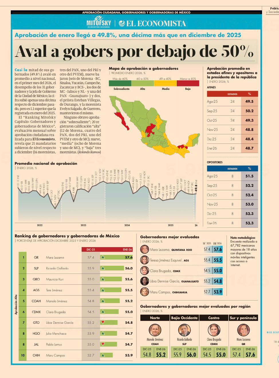 El “Ranking Mitofsky Capítulo: Gobernadores y gobernadoras de México”, evaluación mensual sobre aprobación ciudadana realizada para El Economista, revela que 21 mandatarios subieron de nivel respecto a diciembre (16 morenistas, tres del PAN, uno del PRI y otro del PVEM); nueve bajaron (seis de Morena -BC, Sinaloa, Yucatán, Campeche, Zacatecas y BCS-, los dos de MC -Jalisco y NL- y una del PAN -Guanajuato-) y dos, el priista Esteban Villegas, de Durango, y la morenista Evelyn Salgado, de Guerrero, mantuvieron el mismo.