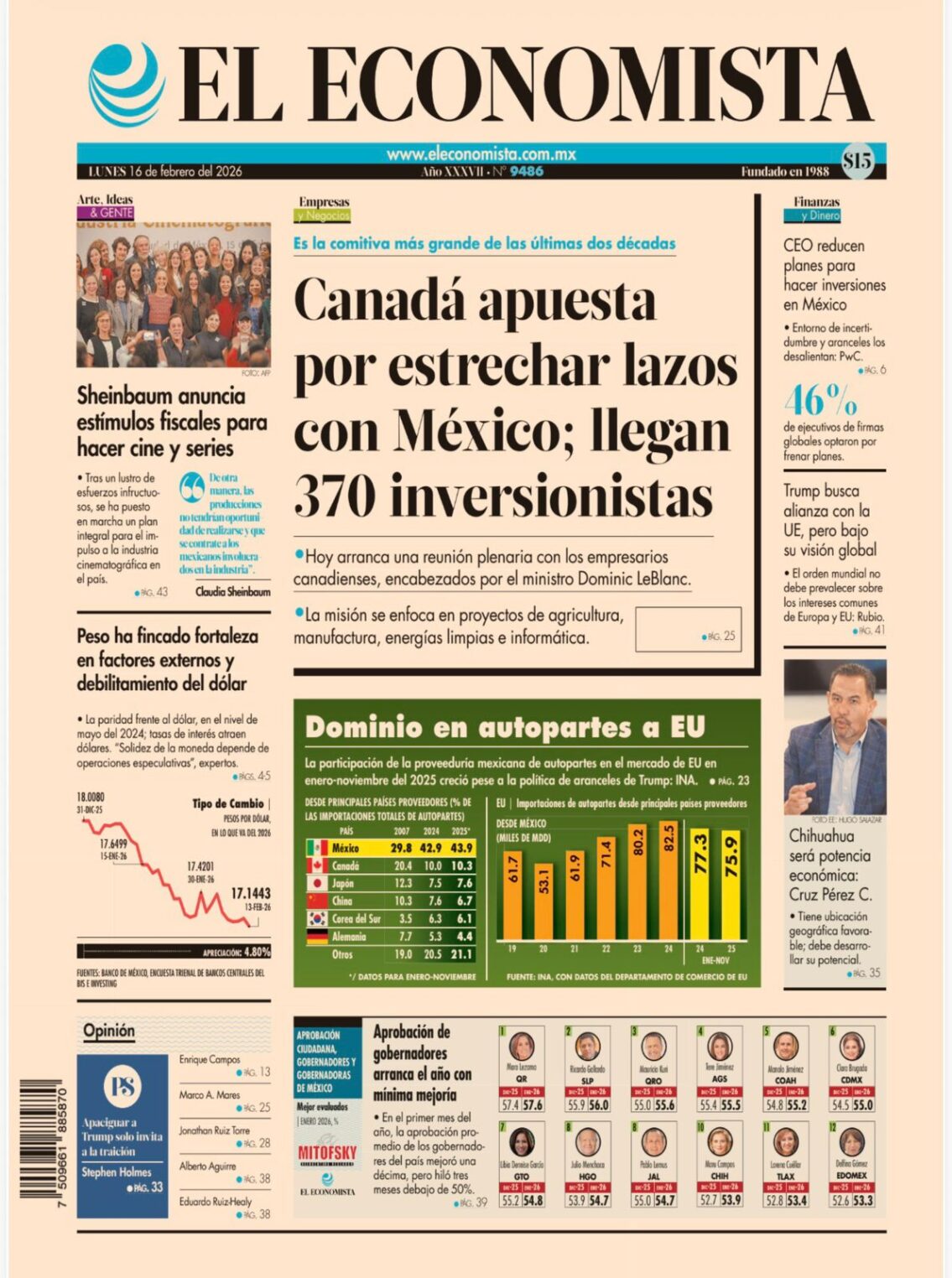 El diario especializado El Economista publica en su edición de este lunes que Lezama Espinosa registra el nivel más alto de aprobación, posicionándose con el mayor respaldo ciudadano a nivel nacional.