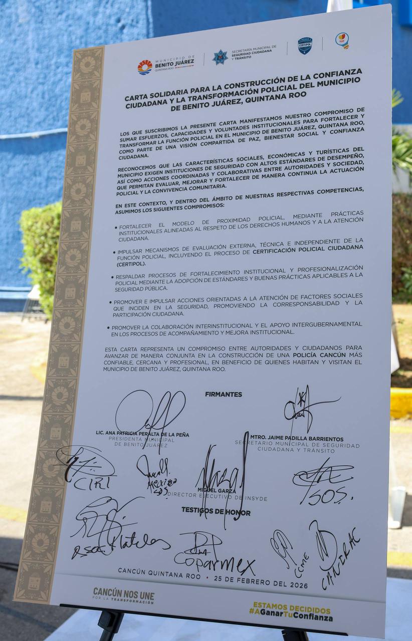 Como parte del evento, las autoridades y representantes de diferentes cámaras empresariales en su calidad de testigos de honor, firmaron la carta solidaria para la construcción de la confianza ciudadana y la transformación policial del municipio, que plasma el compromiso para consolidar una Policía más confiable, cercana y profesional en beneficio de los habitantes, gracias a cinco acciones clave: Modelo de proximidad policial; evaluación externa, técnica e independiente de la función policial, incluyendo la certificación policial ciudadana; estándares y buenas prácticas; atención de factores sociales; y apoyo interinstitucional.