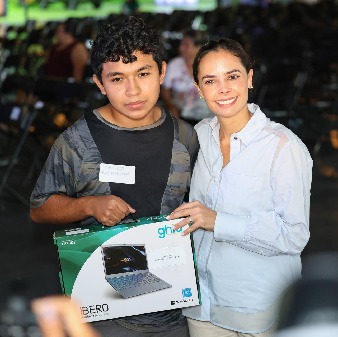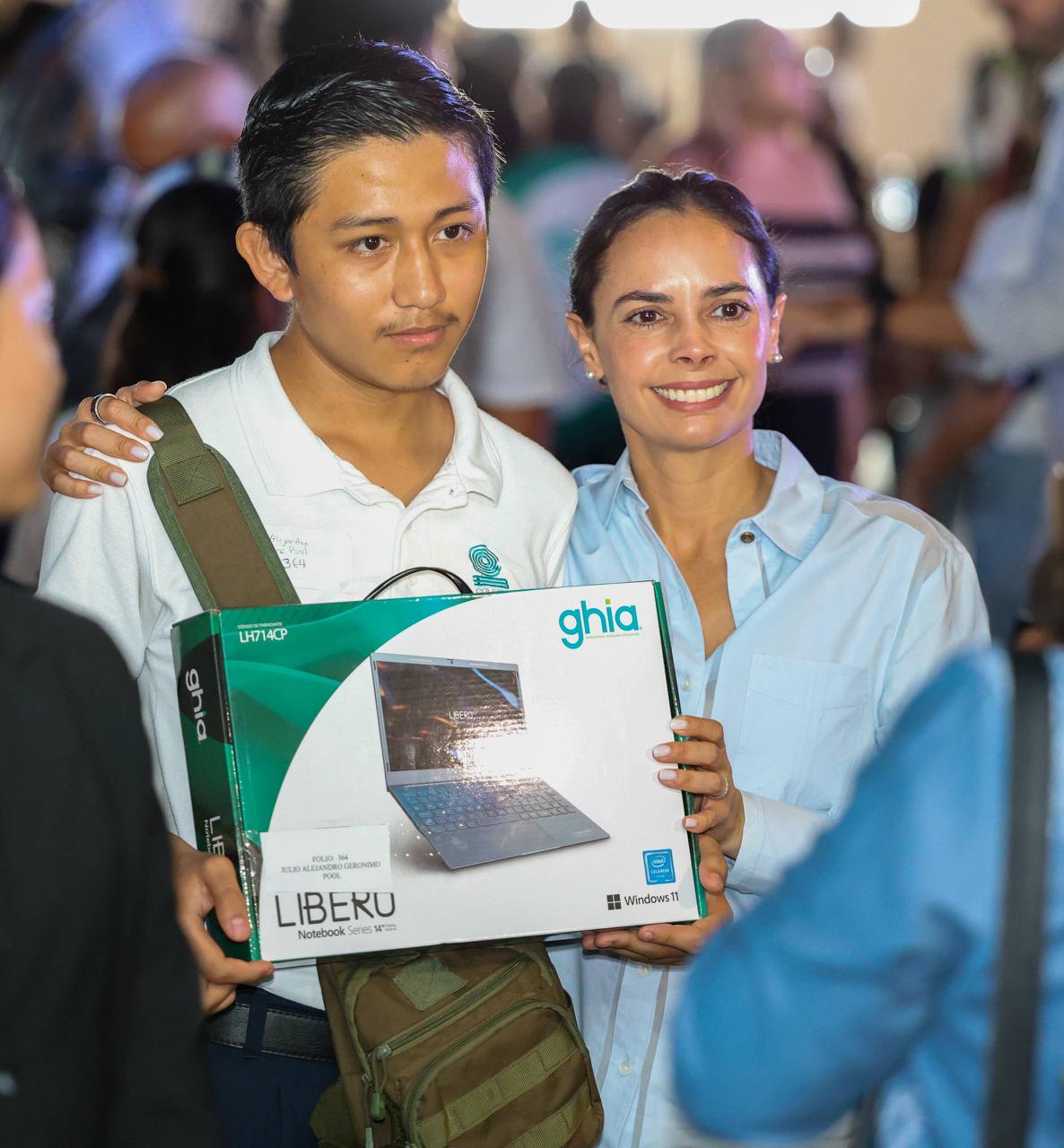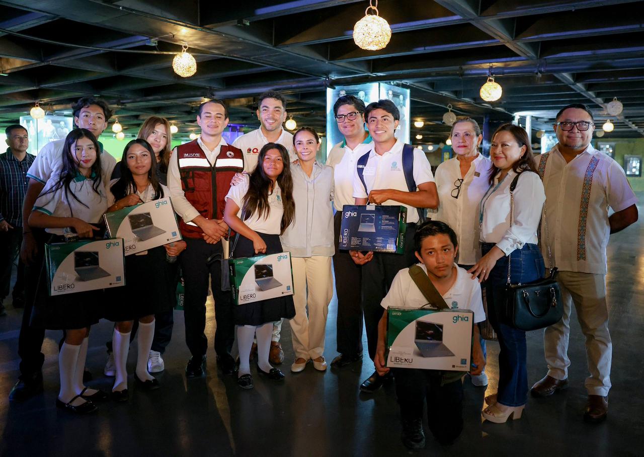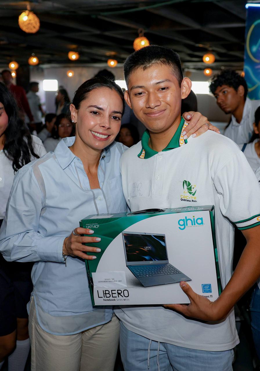 Luego de celebrar que las y los jóvenes interesados se hayan inscrito en la convocatoria, Ana Paty Peralta hizo entrega de las computadoras de manera simbólica a dos estudiantes del Colegio de Estudios Científicos y Tecnológicos del Estado de Quintana Roo (CECyTE) II: María de los Ángeles Rivera Casanova y Amir Emmanuel Maya Ayala.
