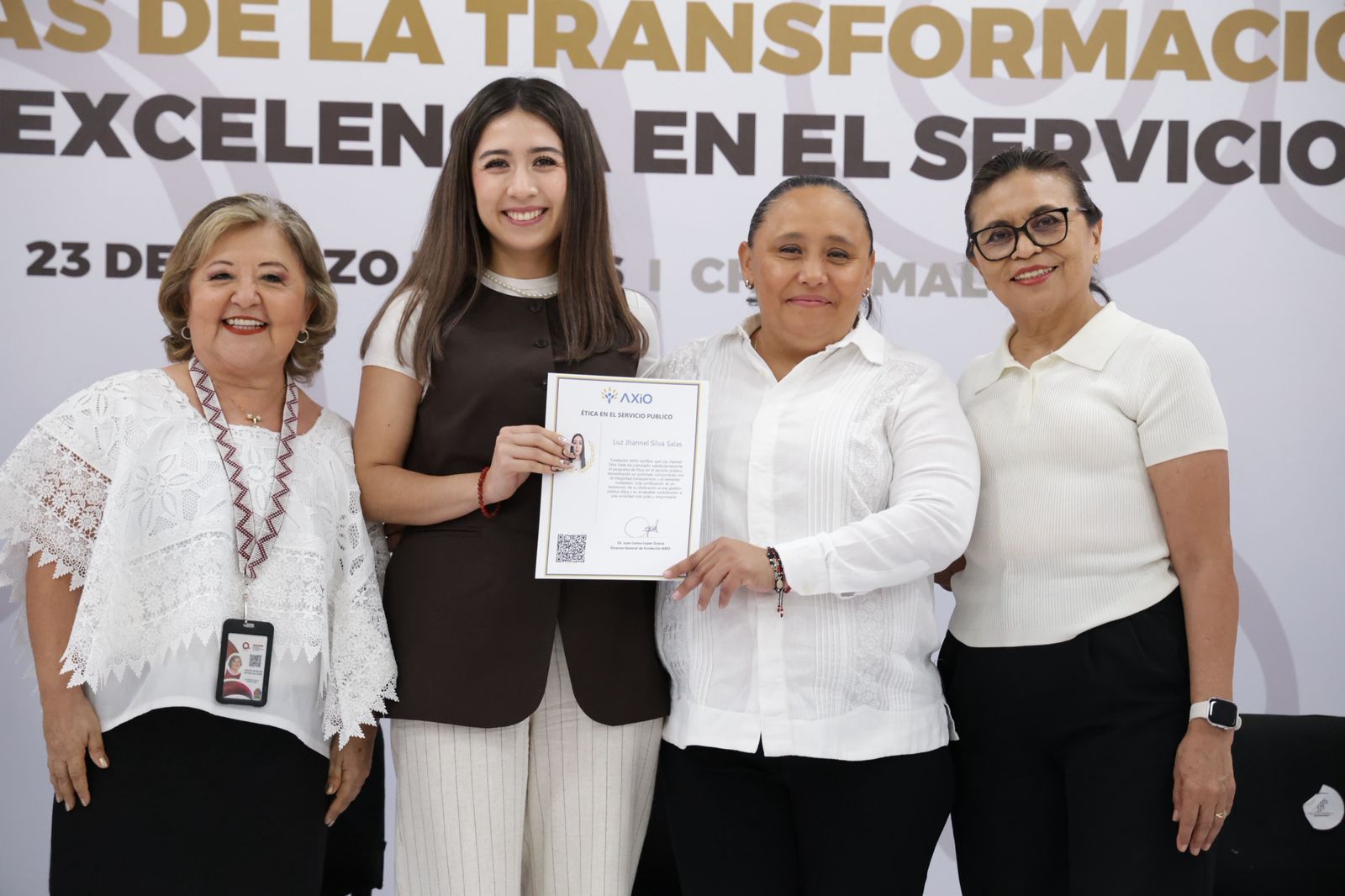 Asimismo, más de 300 personas servidoras públicas concluyeron el proceso de certificación en Ética Pública, impartido por la Fundación AXIO, fortaleciendo sus capacidades para conducirse con integridad, prevenir actos de corrupción y tomar decisiones responsables en beneficio de la sociedad.