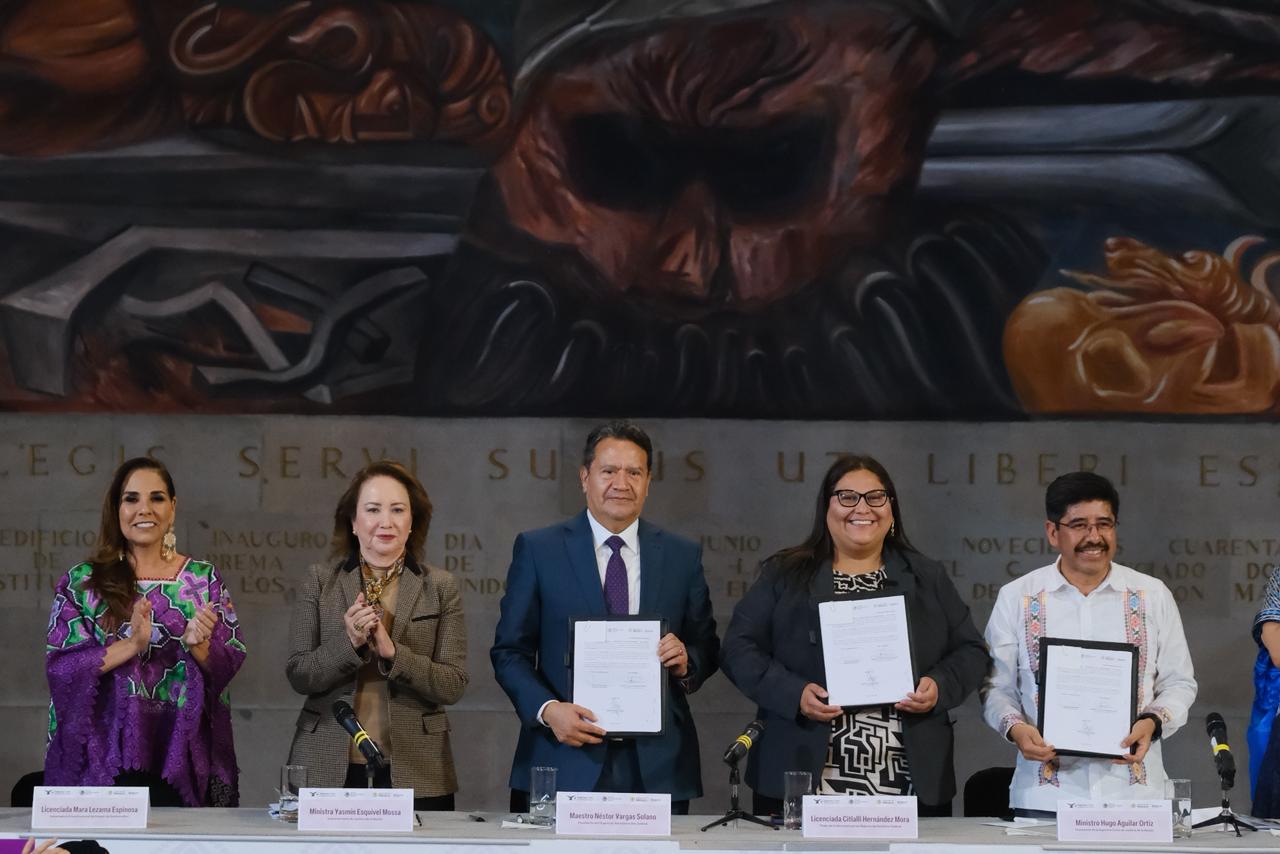 En un paso significativo hacia la consolidación de una justicia más equitativa con perspectiva de género, la gobernadora de Quintana Roo, Mara Lezama Espinosa, en su calidad de presidenta de la Comisión para la Igualdad entre Mujeres y Hombres de la Conago, participó en la firma del Convenio Marco de Colaboración entre la Suprema Corte de Justicia de la Nación, el Órgano de Administración Judicial y la Secretaría de las Mujeres, con el objetivo de fortalecer la coordinación institucional en materia de género.
