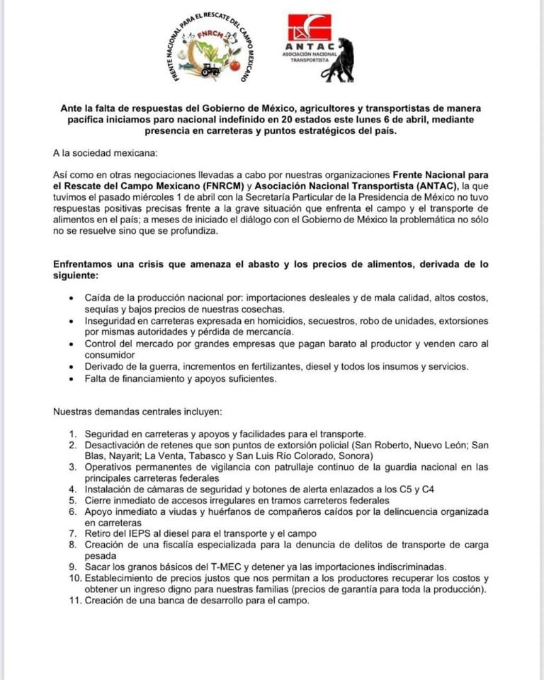 En un comunicado, el Frente Nacional para el Rescate del Campo Mexicano (FNRCM) y la Asociación Nacional de Transportistas (ANTAC) indicaron que su decisión derivó de que, “a meses de iniciado el diálogo con el Gobierno Federal la problemática no se resuelve sino que se profundiza”.