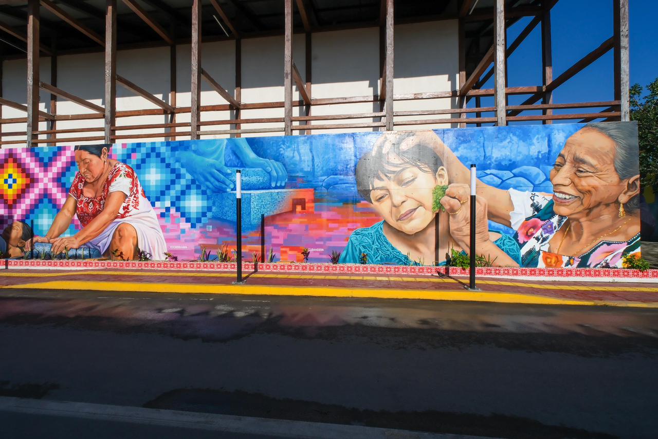Los colores verdes representan Sian Ka´an, los ecosistemas acuáticos, arrecifes de coral y el turismo comunitario; el rojo es la cultura y la historia. Se reflejan a los cruzoob, Tihosuco, los caudillos, la historia de la Santa Cruz, del chicle; a las mujeres en la historia que encarnan resistencia, sabiduría y liderazgo, como Rita Cetina, Elvia Carrillo Puerto, Rosa Torres, Felipa y María Uicab, junto con representaciones colectivas como parteras, curanderas, sacerdotisas y guerreras; las bordadoras, artesanas, leyendas como la Xtabay. Incluso hay un mural que refleja a Pedro Infante con su gran amigo Ruperto Prado.