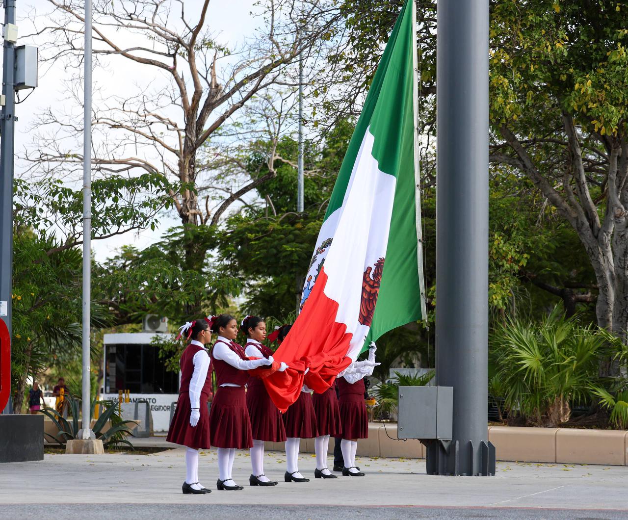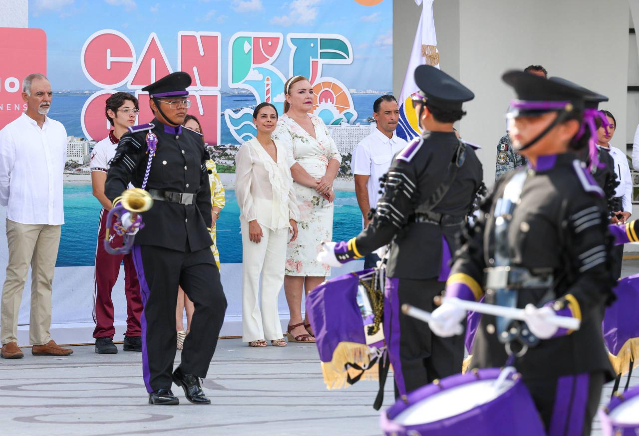 Durante esta celebración de aniversario, se contó con los honores para el izamiento del Lábaro Patrio por parte de la escolta de la Secundaria Técnica número 11 “Moisés Sáenz Garza” y la Banda de Guerra del Colegio de Estudios Científicos y Tecnológicos (CECyTE) Cancún Plantel II; mientras que el alumno, Neytan Ithan Vital Echeverría del tercer grado de secundaria, recitó el juramento a la bandera, seguido de los himnos a Quintana Roo y Nacional Mexicano entonados por la Orquesta Municipal “Benito Juárez”.