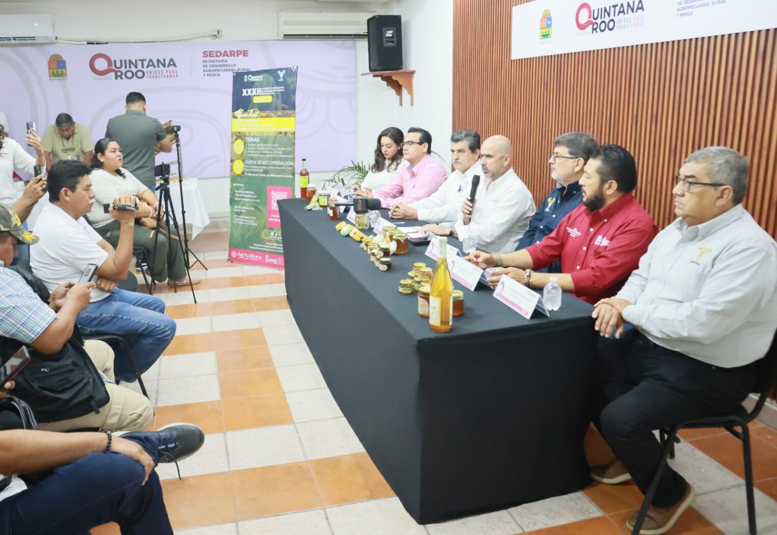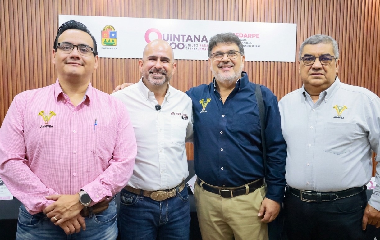 En conferencia de prensa estuvieron presentes el presidente de la ANMVEA, MVZ. Sóstenes Rafael Rodríguez Dehaibes; el vicepresidente de la ANMVEA, MVZ. Rodrigo Abraham Medillín Pico; el tesorero de la ANMVEA, MVZ. José Ordonel Torres Bocanegra, y el titular de la SADER y OREF en Quintana Roo, Enrique Morales Pardo.