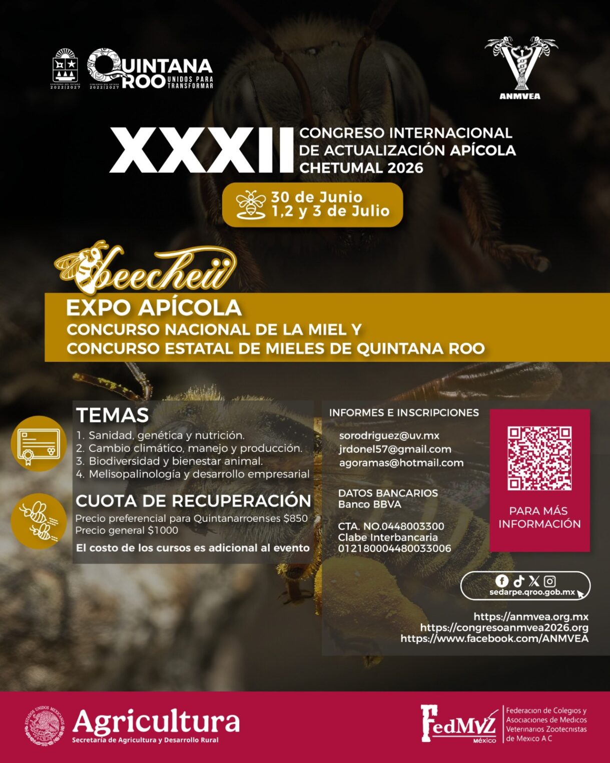 El titular de la Secretaría de Desarrollo Agropecuario, Rural y Pesca (Sedarpe), Jorge Aguilar Osorio, anunció en conferencia de prensa que del 01 al 03 de julio de 2026 se realizará la 32 edición del Congreso Internacional de Actualización Apícola en el Centro de Convenciones de Chetumal. Por primera vez, Quintana Roo y su ciudad capital serán sede de un evento internacional de gran relevancia para el sector apícola, lo que dará mayor visibilidad a la región.