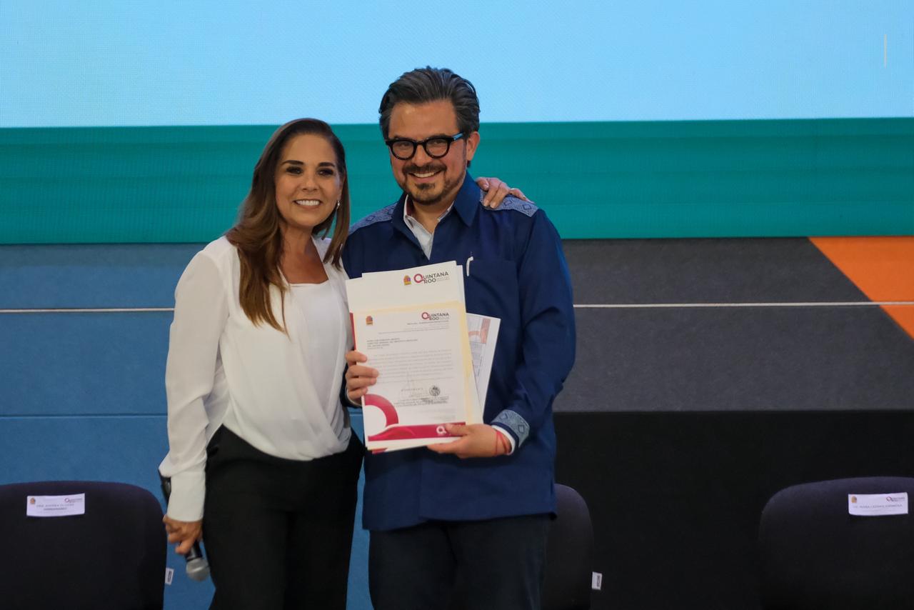 Al finalizar el evento, la gobernadora Mara Lezama entregó a Zoé Robledo documentos relativos a la donación de predios para infraestructura del IMSS, uno de Cozumel y otro de Cancún.