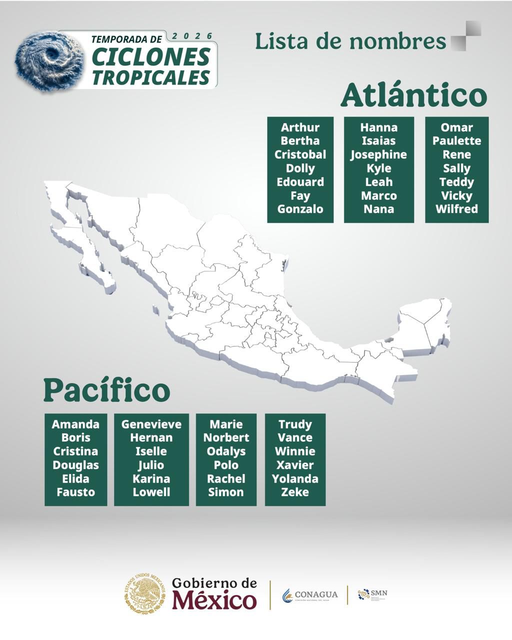 La Comisión Nacional del Agua (Conagua) dio a conocer el pronóstico oficial de la temporada de ciclones tropicales 2026 en el Atlántico, en la que se prevé la formación de entre 11 y 15 sistemas, informó la gobernadora Mara Lezama Espinosa.