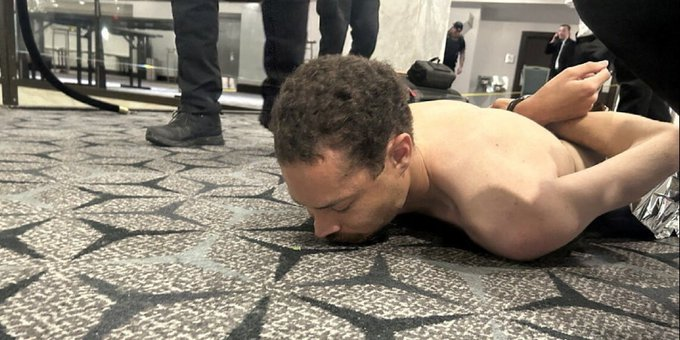 Trump compartió dos imágenes que muestran al sospechoso tendido en el suelo, boca abajo y sin ropa, mientras es custodiado por agentes de las fuerzas de seguridad tras ser detenido.